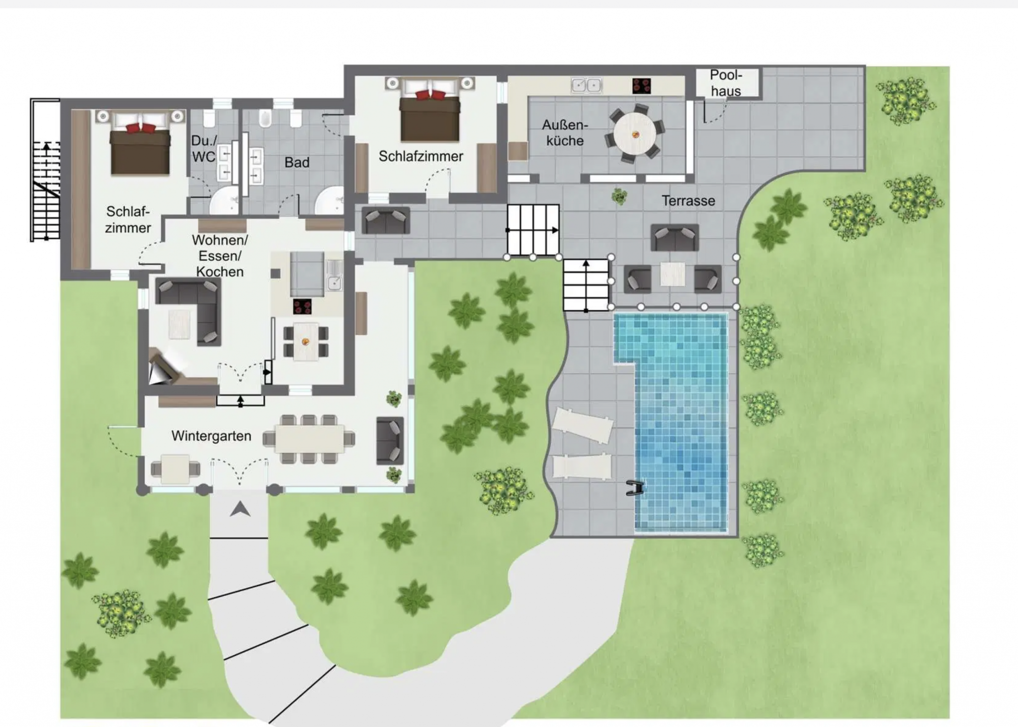 Enjoy the tranquility of nature while relaxing in the beautifully landscaped garden, featuring a large pool of 63 m². The property offers ample living space with 4 bedrooms, 5 bathrooms, and an additional WC. The kitchens inside, along with a spacious outdoor kitchen and patio, make it perfect for entertaining.